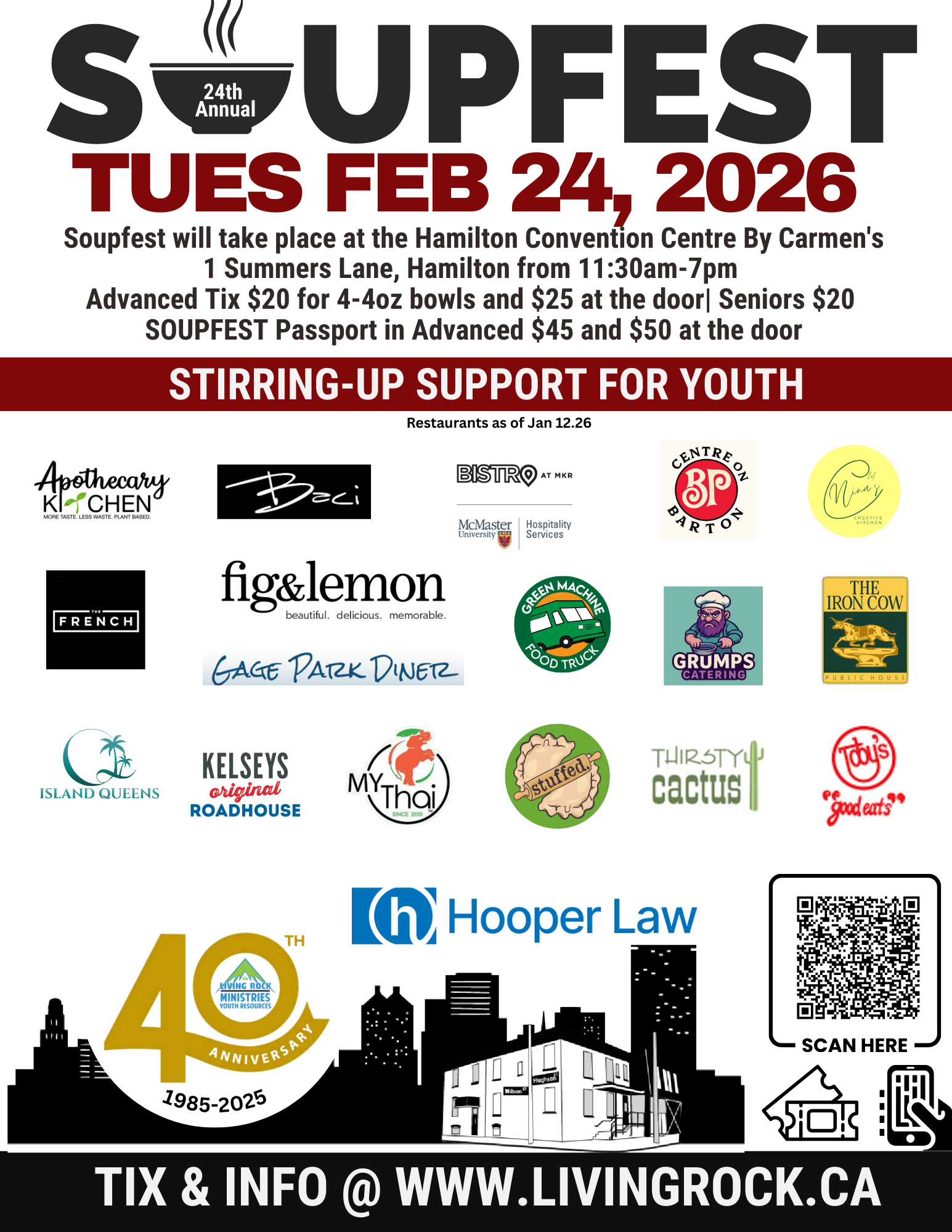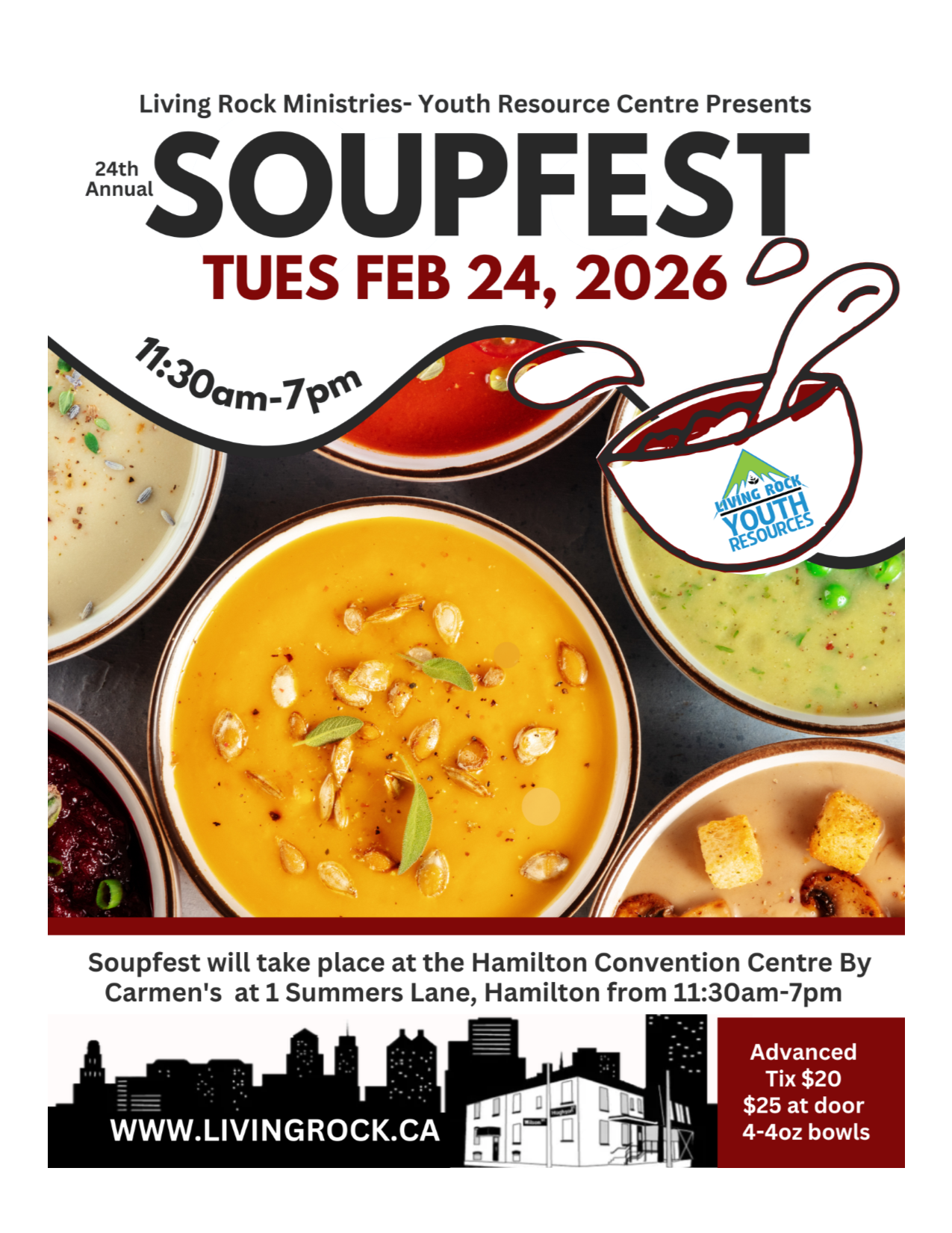 Soupfest is the major annual fundraiser for Living Rock Youth Resource Centre, a non-profit youth resource center in Hamilton. Located downtown, Living Rock has been supporting vulnerable youth since 1985. The funds raised through Soupfest are directed to programs, services and resources offered to youth in need. Living Rock offers a place of belonging, safety, and a bridge to the community while supporting youth to develop a personal vision for their lives.