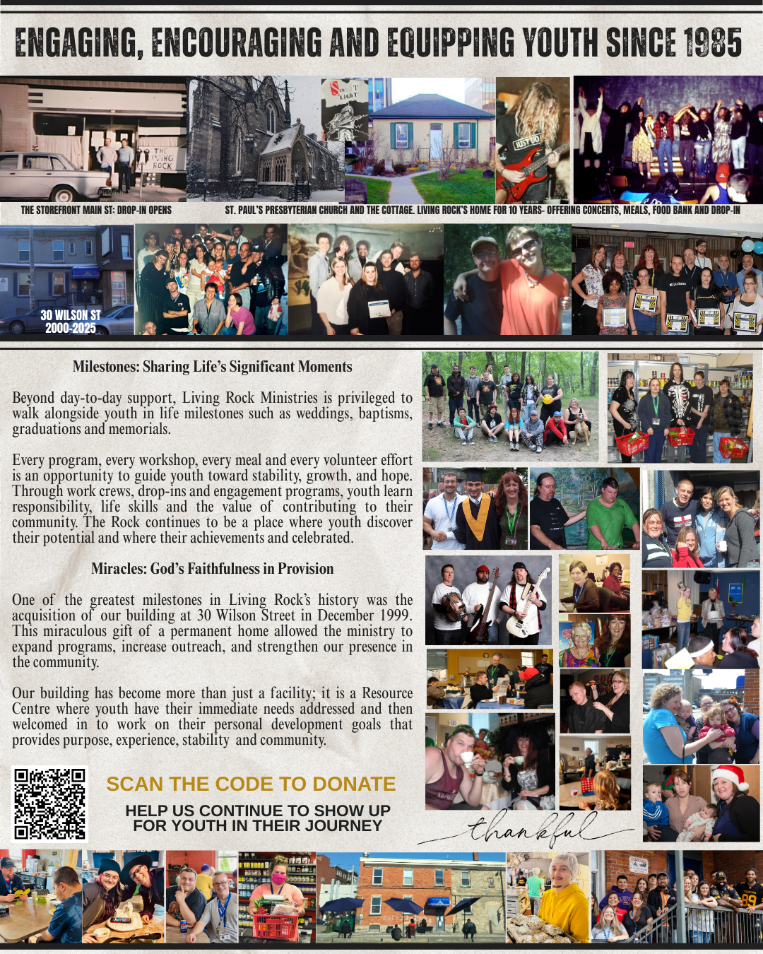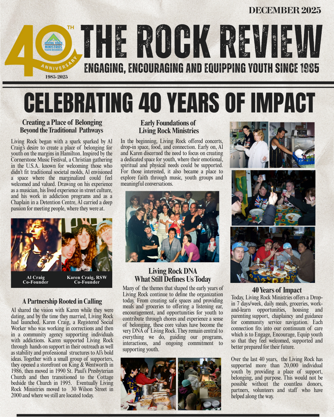 As we celebrate our 40th anniversary, we pause to honour the thousands of youth who have walked through our doors, the community that has journeyed alongside us, and the staff, volunteers, and supporters who have made this work possible. Together, we look forward with thanksgiving and hope—committed to ensuring that Living Rock continues to be a safe, welcoming place for generations to come.