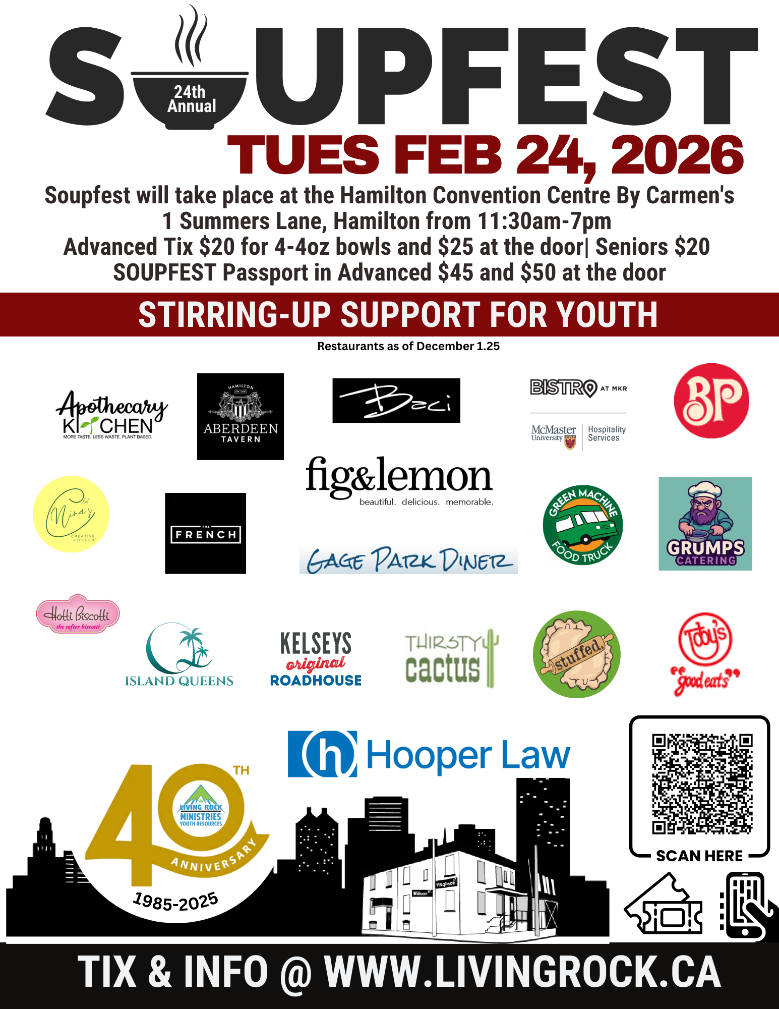 Soupfest is the major annual fundraiser for Living Rock Youth Resource Centre, a non-profit youth resource center in Hamilton. Located downtown, Living Rock has been supporting vulnerable youth since 1985. The funds raised through Soupfest are directed to programs, services and resources offered to youth in need. Living Rock offers a place of belonging, safety, and a bridge to the community while supporting youth to develop a personal vision for their lives.